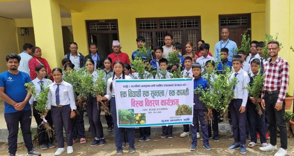 बागलुङ / बढ्दो जलवायु परिवर्तन न्यूनीकरण र विद्यार्थीहरुलाई कृषि तथा उत्पादनसगँ जोड्ने उद्देश्यले एक बिद्यार्थी एक कागती र एक सुन्तलाकाे बिरुवा वितरण गरिएको छ ।