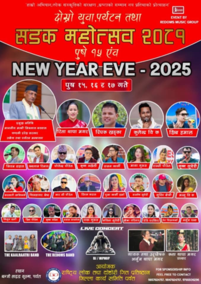 पर्वत / हाम्राे अभियान, लाेक संस्कृतीकाे संरक्षण,स्रष्टाकाे सम्मान नव प्रतिभाकाे प्राेत्साहन भन्ने मुल नाराका साथ स्थापना भएकाे राष्ट्रिय लाेक तथा दाेहाेरी गित प्रतिष्ठान नेपाल जिल्ला कार्य समिति पर्वतले अङ्ग्रेजी नयाँ बर्ष २०२५ काे अवसर पारेर दाेस्राे युवा पर्यटन तथा सडक महाेत्सब २०८१ काे आयोजना गर्ने भएको छ ।