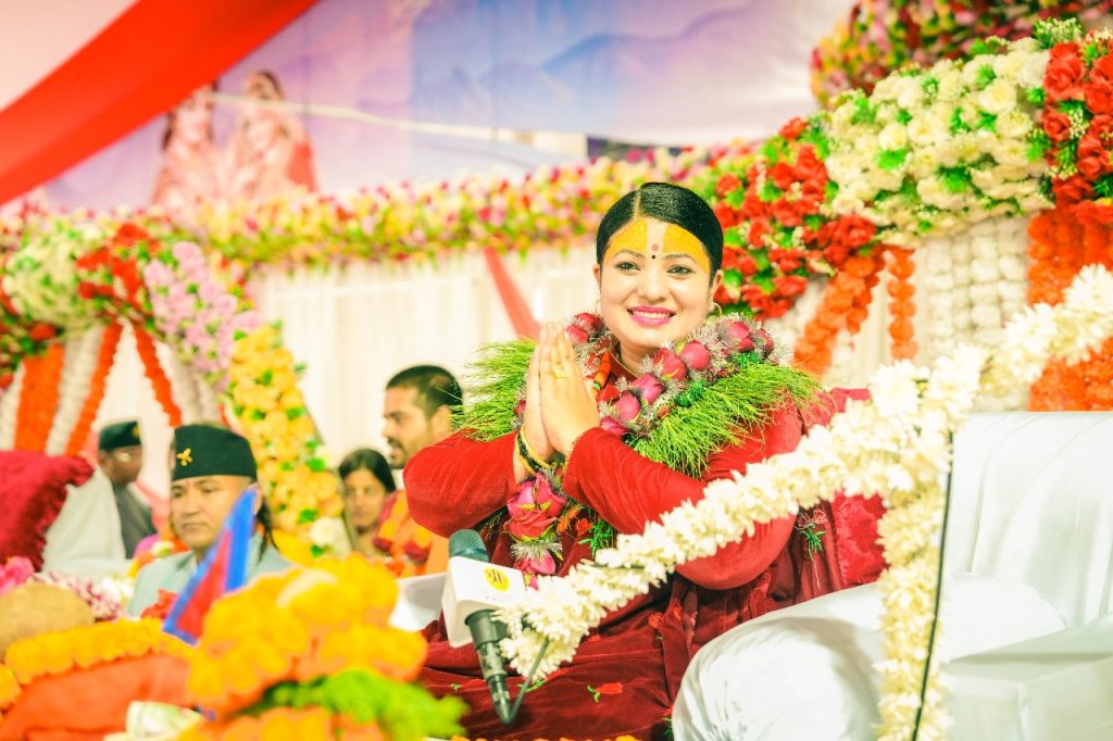 पोखरामा जारी श्री गण्डकी शतकुण्डीय गायत्री कोटिहोम विराट ज्ञान महायज्ञमा कथा वाचनरत भागवत मञ्जरी राधिका दासी सोमबार गुरुङ समुदायको परम्परागत पहिरनमा प्रस्तुत भइन्।
