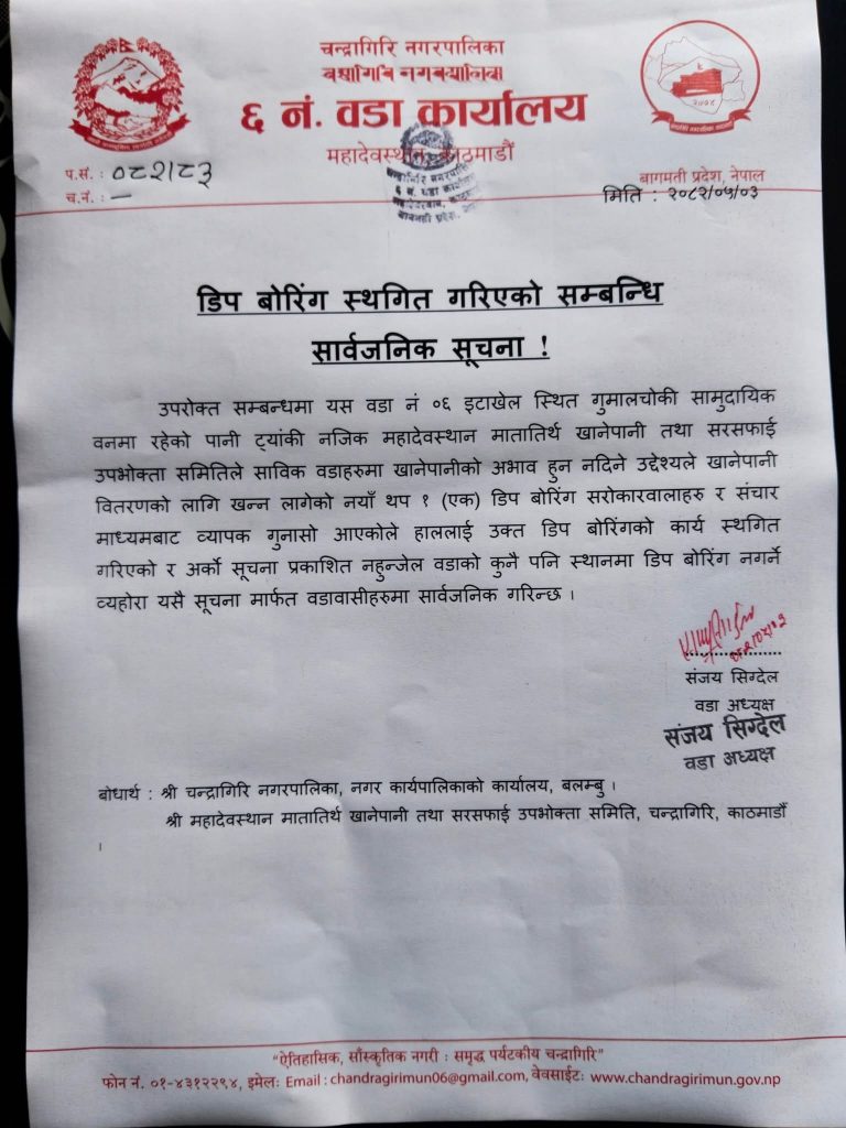 वडा कार्यालयले सार्वजनिक सूचना जारी गर्दै साविक डाइरेक्ट खानेपानी आपूर्तिमा देखिएको समस्या समाधानका लागि नयाँ ट्यब डिप बोरिंगको खन्ने काम अगाडि बढाउन खाेज्दा स्थानीय सराेकारवाला र केही संचार माध्यम बाट व्यापक गुनासो आएपछि हाललाई काम स्थगित गरेको वडा अध्यक्ष सिग्देलले बताए ।