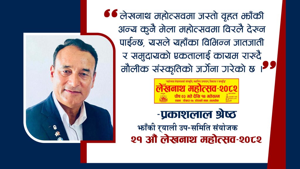 उनका अनुसार, “हरेक वर्ष लेखनाथ महोत्सवमा ठूलो झाँकी र्याली निकालिन्छ । यसले विभिन्न समुदायले कति अपनत्व महसुस गरेका छन् भन्ने देखाउँछ । साथै, फरक–फरक जातजाति र समुदायलाई एउटै थलोमा ल्याएर उनीहरूको मौलिक रीतिरिवाज, रहनसहन तथा संस्कार–संस्कृतिको जगेर्ना गर्ने काम महोत्सवले गर्दै आएको छ,” संयोजक श्रेष्ठले भने ।