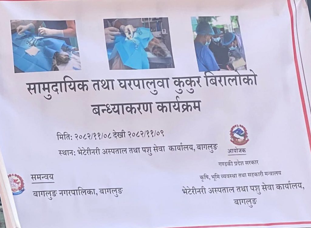 बागलुङ, भेटेनरी अस्पताल तथा पशु सेवा कार्यालय बागलुङको आयोजनामा र बागलुङ नगरपालिकाको समन्वयमा सामुदायिक तथा घरपालुवा कुकुर–बिरालोको बन्ध्याकरण कार्यक्रम सुरु गरिएको छ।
