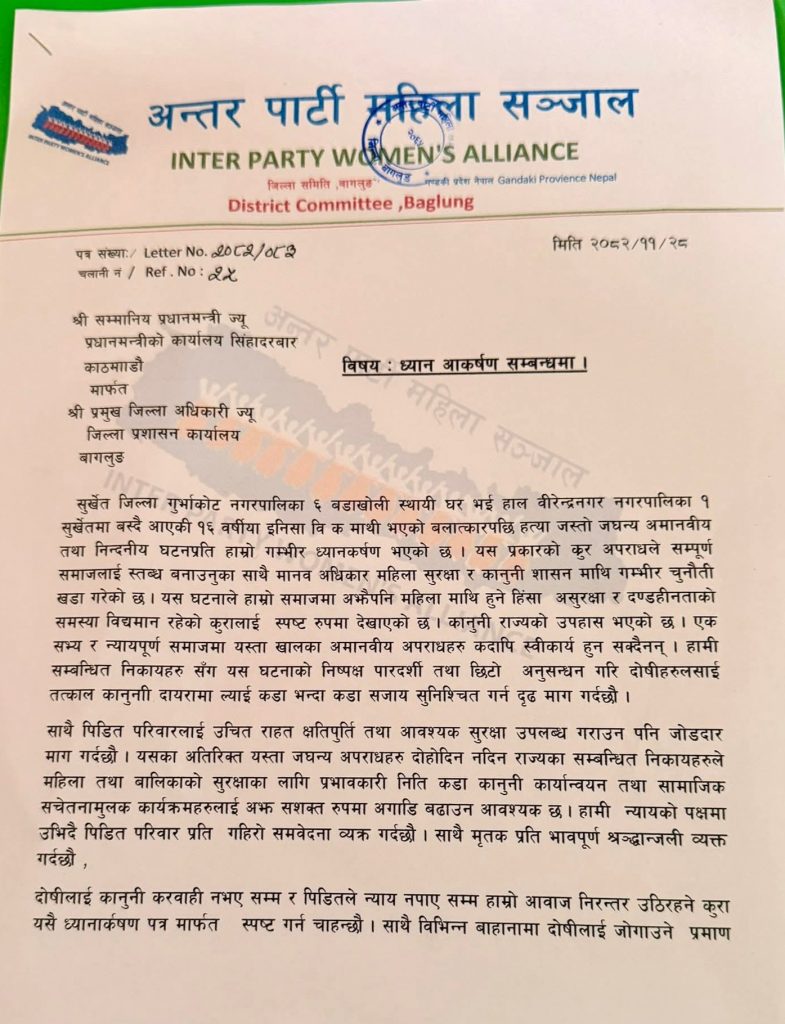 सुर्खेतकी १६ वर्षीया किशोरी इन्सा विकको बलात्कारपछि हत्या भएको घटनाप्रति अन्तर पार्टी महिला सञ्जाल जिल्ला समिति बागलुङले गम्भीर ध्यानाकर्षण भएको जनाएको छ। सञ्जालले दोषीमाथि कडा कानुनी कारबाही गर्न सरकारसँग माग गरेको छ।