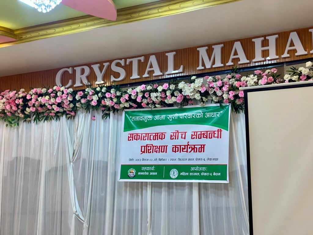 पोखरा–६, लेकसाइडस्थित क्रिस्टल महलमा २०८३ साल बैशाख १ गते बिहीबार आयोजित कार्यक्रममा महिलाहरूको मानसिक स्वास्थ्य, पारिवारिक सुदृढीकरण तथा सकारात्मक सोच विकासका विषयमा प्रशिक्षण प्रदान गरिएको थियो।