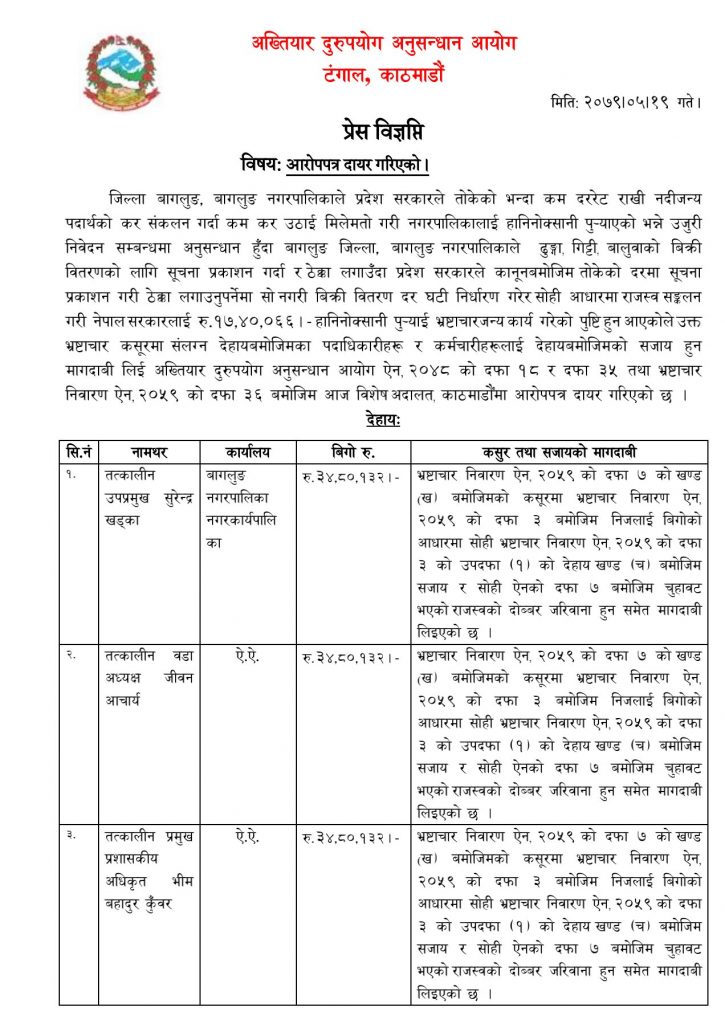 जिल्ला बागलुङ, बागलुङ नगरपालिकाले प्रदेश सरकारले तोकेको भन्दा कम दररेट राखी नदीजन्य पदार्थको कर संकलन गर्दा कम कर उठाई मिलेमतो गरी नगरपालिकालाई हानिनोक्सानी पुर्याएको भन्ने उजुरी निवेदन सम्बन्धमा अनुसन्धान हुँदा बागलुङ जिल्ला, बागलुङ नगरपालिकाले ढुङ्गा, गिट्टी, बालुवाको बिक्री वितरणको लागि सूचना प्रकाशन गर्दा र ठेक्का लगाउँदा प्रदेश सरकारले कानूनबमोजिम तोकेको दरमा सूचना प्रकाशन गरी ठेक्का लगाउनुपर्नेमा सो नगरी बिक्री वितरण दर घटी निर्धारण गरेर सोही आधारमा राजस्व सङ्कलन गरी नेपाल सरकारलाई रु.१७,४०,०६६।- हानिनोक्सानी पुर्याई भ्रष्टाचारजन्य कार्य गरेको पुष्टि हुन आएकोले उक्त भ्रष्टाचार कसूरमा संलग्न देहायबमोजिमका पदाधिकारीहरू र कर्मचारीहरूलाई देहायबमोजिमको सजाय हुन मागदाबी लिई अख्तियार दुरुपयोग अनुसन्धान आयोग ऐन, २०४८ को दफा १८ र दफा ३५ तथा भ्रष्टाचार निवारण ऐन, २०५९ को दफा ३६ बमोजिम आज विशेष अदालत, काठमाडौँमा आरोपपत्र दायर गरिएको छ ।