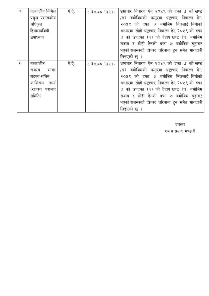 अख्तियार दुरुपयोग अनुसन्धान आयोगले नगरपालिकाका निवर्तमान उप-प्रमुख सुरेन्द्र खड्का, तत्कालीन प्रमुख प्रशासकीय अधिकृत भिम बहादुर कुँवर, वडा नम्बर-२ का तत्कालीन वडा अध्यक्ष जीवन आचार्य, तत्कालीन प्रमुख प्रशासकीय अधिकृत हिमालय जिवि उपाध्याय र राजस्व शाखाका सदस्य सचिव काशिराम शर्माले नेपाल सरकारलाई रु.१७ लाख भन्दा बढी हानिनोक्सानी पुर्याई भ्रष्टाचारजन्य कार्य गरेको पुष्टि हुन बिगोदावी तथा कैद सजायको माग गरेको आयोगका सहायक प्रवक्ता वेद प्रसाद भण्डारीले जानकारी गराउनुभएको छ ।