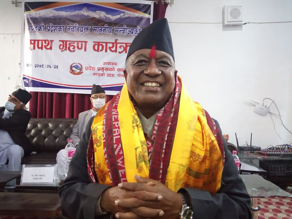 उनलाई प्रदेश प्रमुख पृथ्वीमान सिंह गुरुङले पद तथा गोपनीयताको शपथ गराएका हुन् । मन्त्री नियुक्त भए पनि उनको मन्त्रालय भने तोकिएको छैन ।