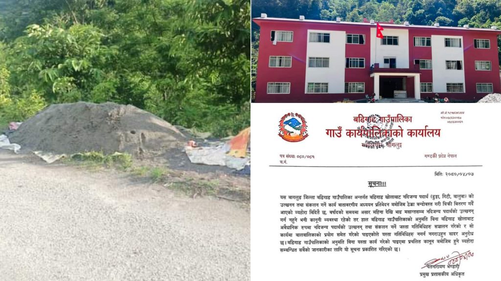 गाउँपालिकाले बडिगाखोलामा अवैध रुपमा भइरहेको नदीजन्य पदार्थको उत्खनन तुरुन्त रोक्ने निर्देशन दिएको छ ।