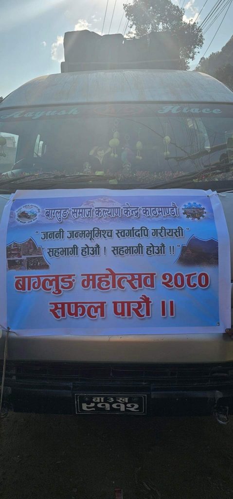 बागलुङ महोत्सवमा आउने बाचा अनुसार बाग्लुङ समाज काठमाडौंमा कर्मथलाे बनाएर ब्यवसाय गर्दै काठमाडौं मै बसाेबास गर्दै आएका दाजुभाइ दिदीबहिनीहरू बागलुङ महाेत्सव सफल पार्न स्वर्ग भुमी बागलुङ तर्फ प्रस्थान गरेका छन् ।