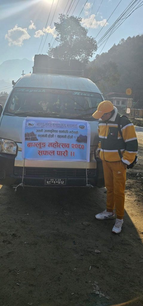 बागलुङ पर्यटन, कृषि, कला संस्कृति, उद्योग र व्यापार समुन्नत बागलुङ निर्माणको आधार’ भन्ने नारासाथ गण्डकी प्रदेशको दाेस्राे ठूलो ब्यापारी केन्द्र बागलुङमा पुस ११ गतेदेखि हुने सातौं बागलुङ महोत्सव सफल बनाउन काठमाडौ देखि यात्रामा निस्केको किस्मत जंङ्ग राजभण्डारीले बताए ।