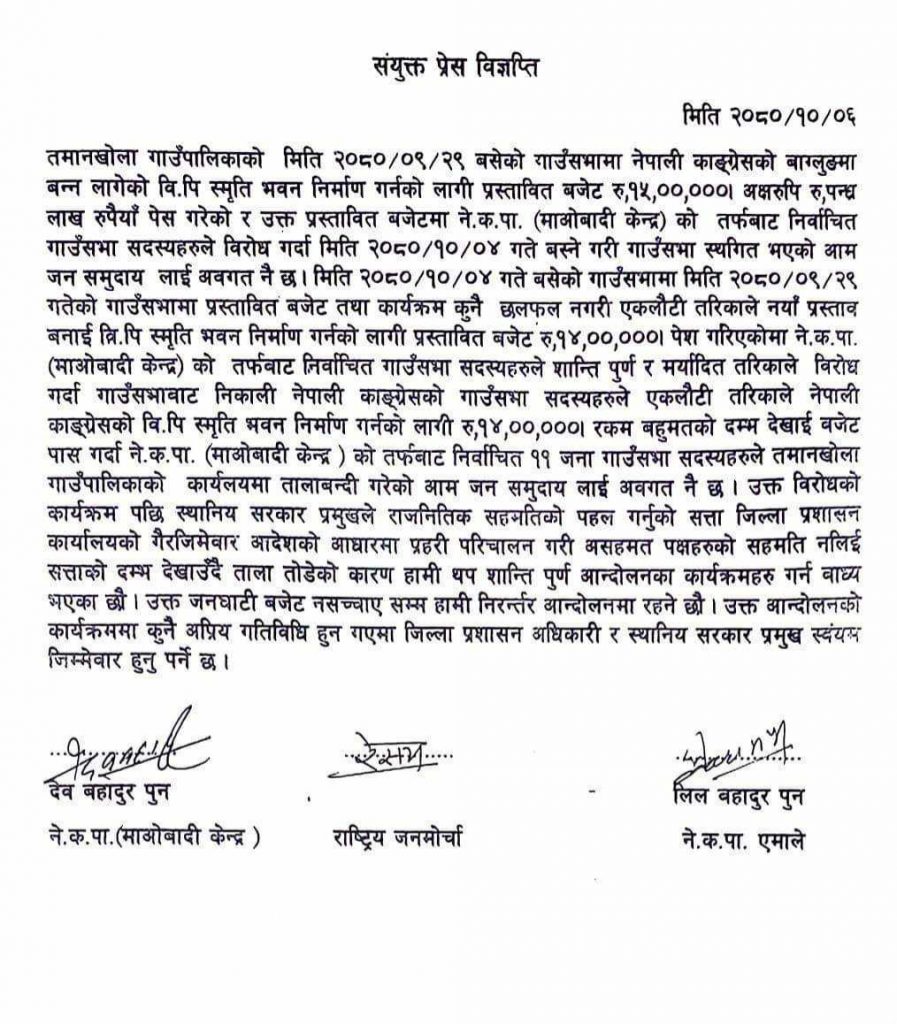 बुधबार बिहान बसेको सर्वदलीय बैठकले गाउँसभाबाट विनियोजित १४ लाख रुपैयाँ वीपी स्मृति भवन निर्माणका लागि खर्च नगर्ने निर्णय गरेको हो । नेपाली कांग्रेसबाट निर्वाचित तमानखोला गाउँपालिका वडा नम्बर ३ का वडाध्यक्ष झगबहादुर बुढा मगरको अध्यक्षतामा बसेको बैठकले वीपी स्मृति भवन निर्माणका लागि गरिएको निर्णयलाई उल्टियाउँदै सहमतिमा योजना छनोट गर्ने निर्णय भएको वडा नम्बर ४ का वडाध्यक्ष छवी श्रीपालीले जानकारी दिए ।