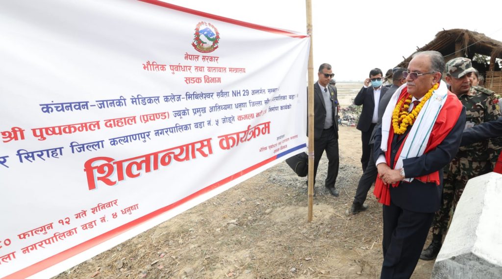धनुषा, १२ फागुन : प्रधानमन्त्री पुष्पकमल दाहाल ‘प्रचण्ड’ले धनुषा र सिरहा जोड्ने पक्की पुलको शिलान्यास गर्नुभएको छ ।