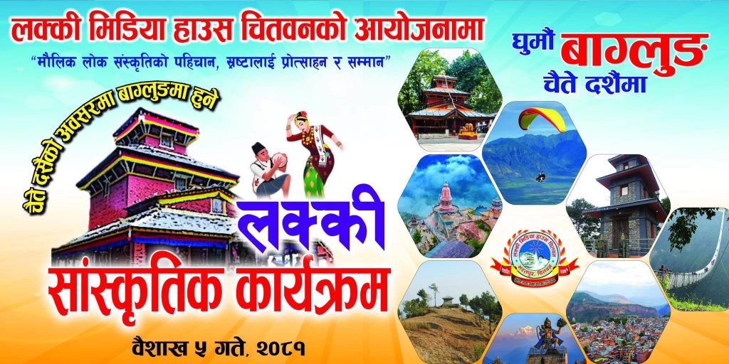चितवन। मोफसलकै चर्चित लक्की मिडिया हाउस चितवनले बागलुङमा चैते दसैँ मेलाको अवसरमा यस वर्ष सांस्कृतिक कार्यक्रम गर्ने भएको छ ।